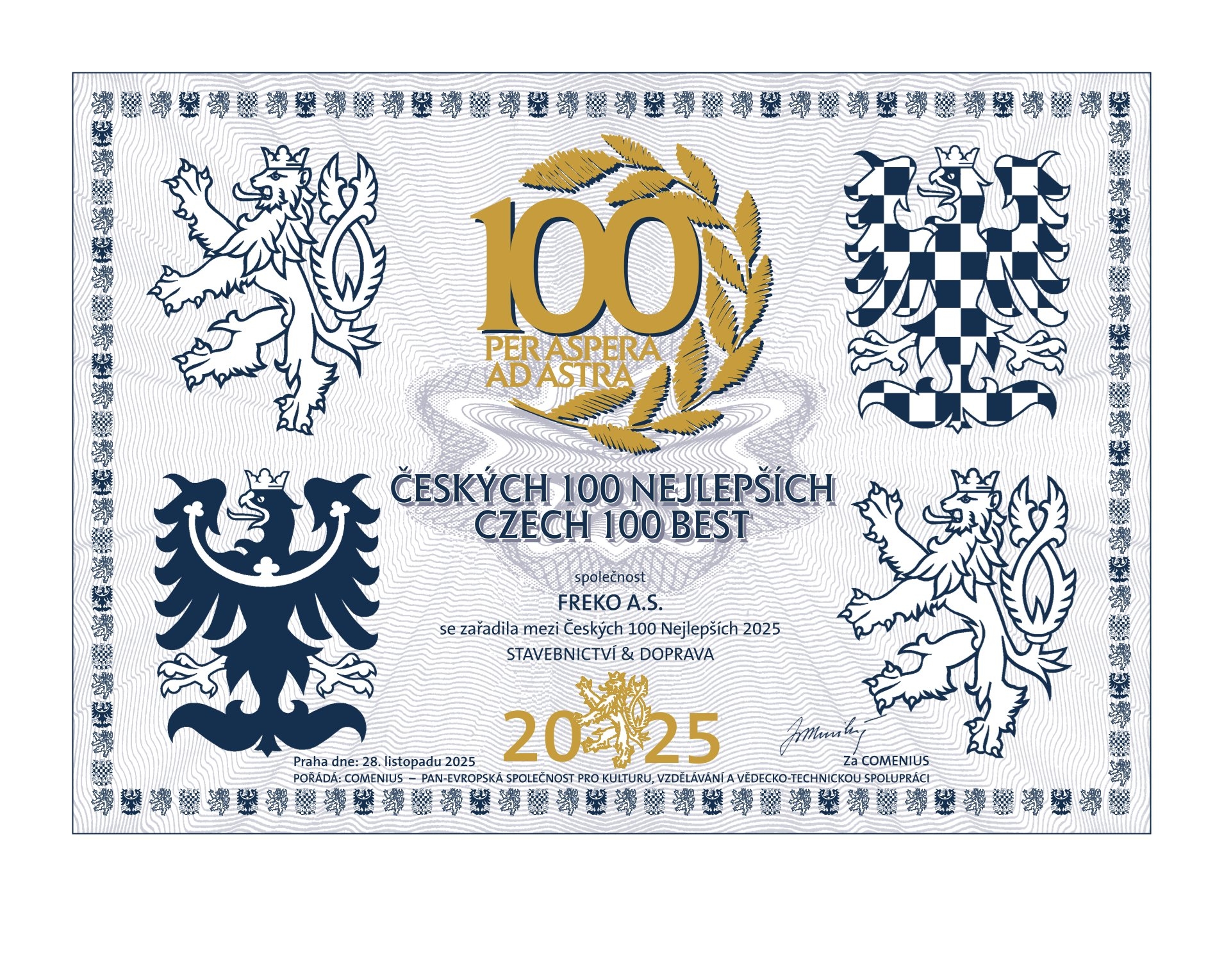 V pražském Obecním domě byly v pátek 28. listopadu 2025 slavnostně předány ceny jubilejního 30. ročníku prestižního podnikatelského žebříčku Českých 100 Nejlepších, který tradičně pořádá společnost Comenius. Cílem projektu je už tři dekády oceňovat výjimečné české firmy napříč obory, a to podle jejich skutečného přínosu, nikoli podle velikosti či obratu. V roce 2021 se naše firma umístila poprvé v této prestižní soutěži. Nyní, na jubilejním 30. ročníku tohoto prestižního celorepublikového žebříčku Českých 100 Nejlepších jsme toto ocenění v kategorii stavebnictví a doprava získali znovu. Při slavnostním ceremoniálu ocenění přebíral Mgr. Tomáš Kolinger, MBA. Jsme na tento fenomenální úspěch právem hrdí, protože se jedná o umístění naší firmy mezi elitou českého byznysu. Toto ocenění je nejen potvrzením kvalitní práce našich pracovníků, ale i motivací k dalšímu růstu firmy s důrazem na stabilitu a odpovědnost podnikání.