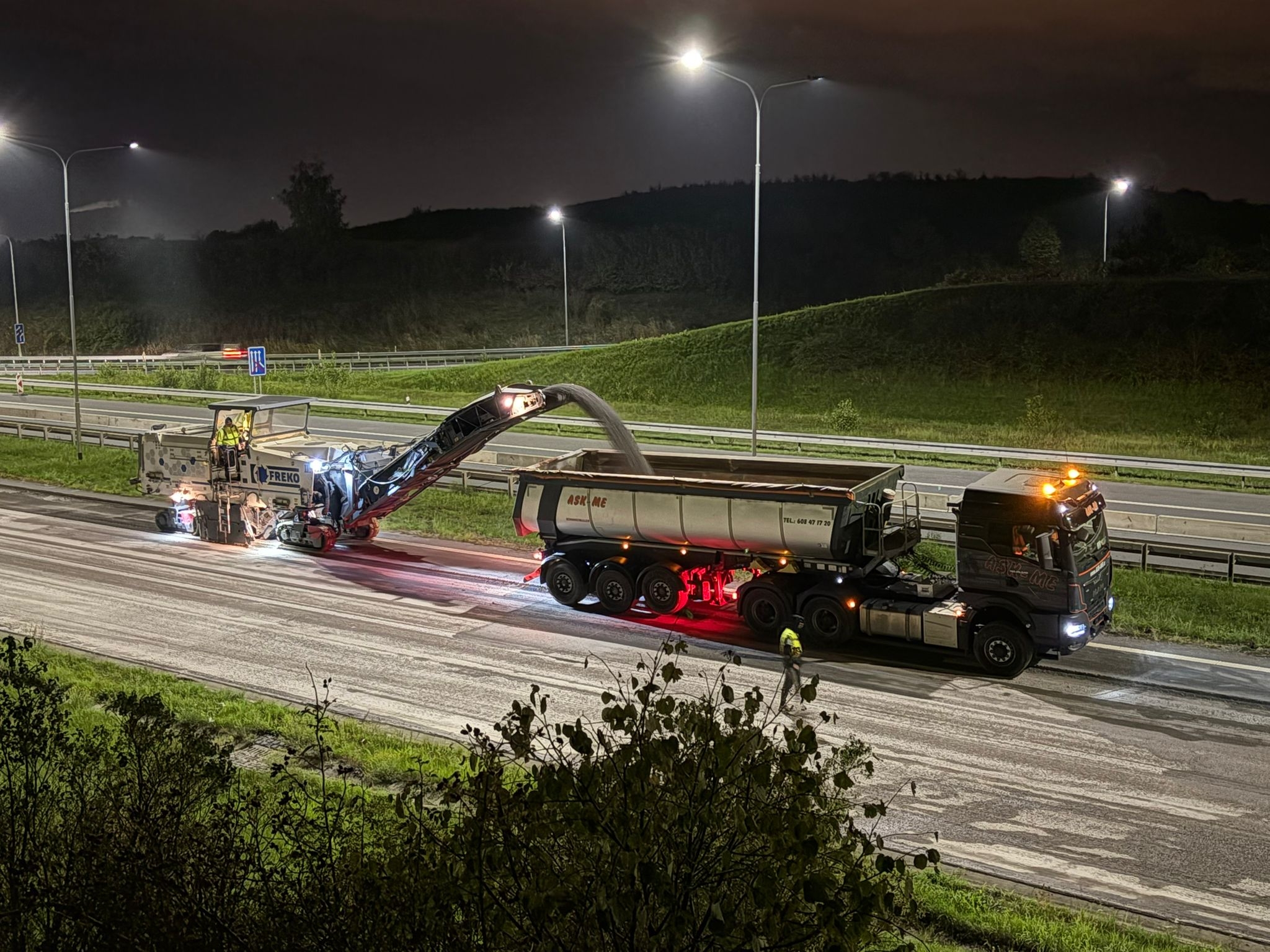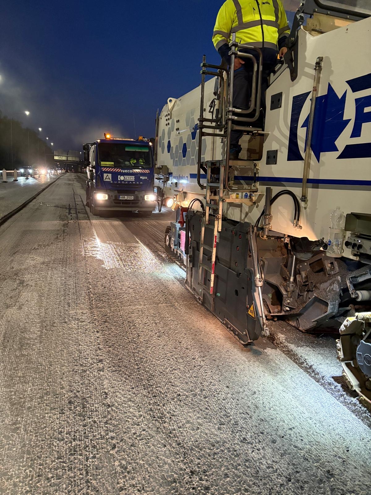 Freko v noci frézovalo, zajišťovalo dopravu vyfrézovaného materiálu včetně zametení, kropení a dobourávání komunikací v rámci III etapy oprav